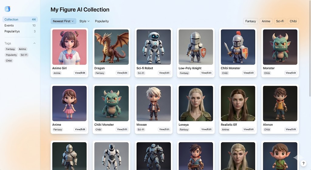 당신의 사진이 3D 피규어가 되는 마법 같은 경험, Figure AI에서 지금 바로 시작하세요! 복잡한 프로그램도, 어려운 프롬프트도 필요 없습니다. 클릭 몇 번이면 누구나 전문가 수준의 3D 캐릭터를 만들 수 있습니다.