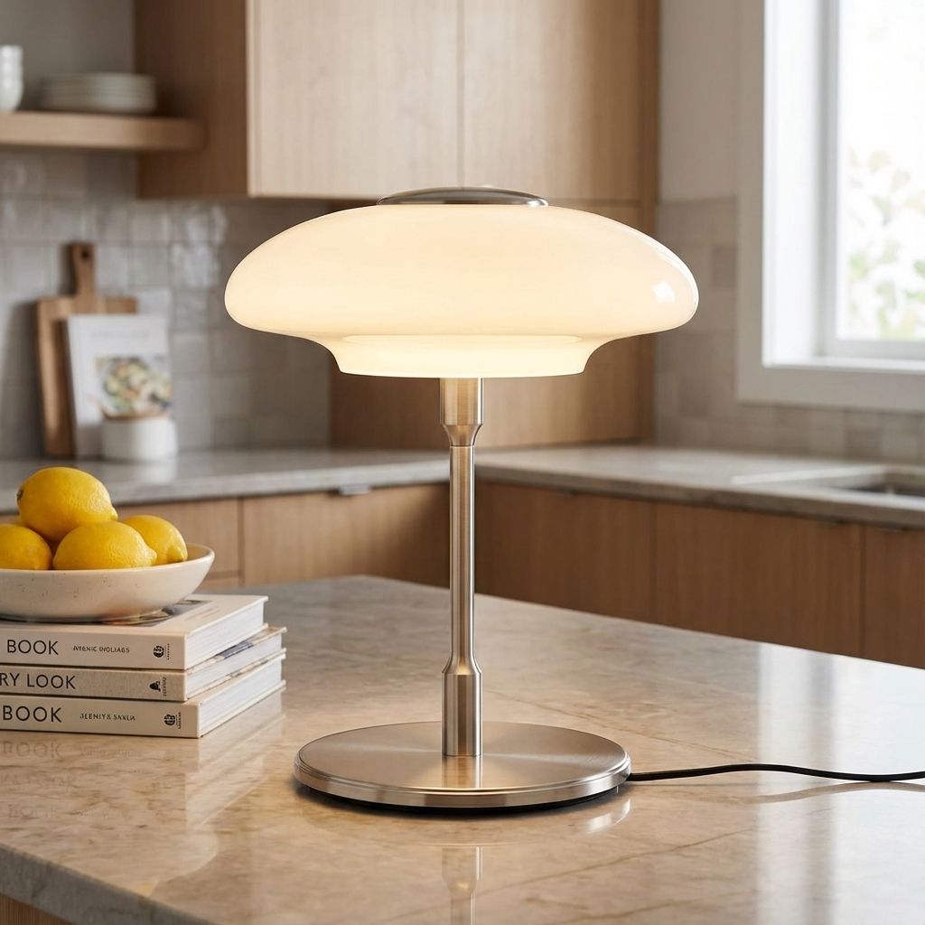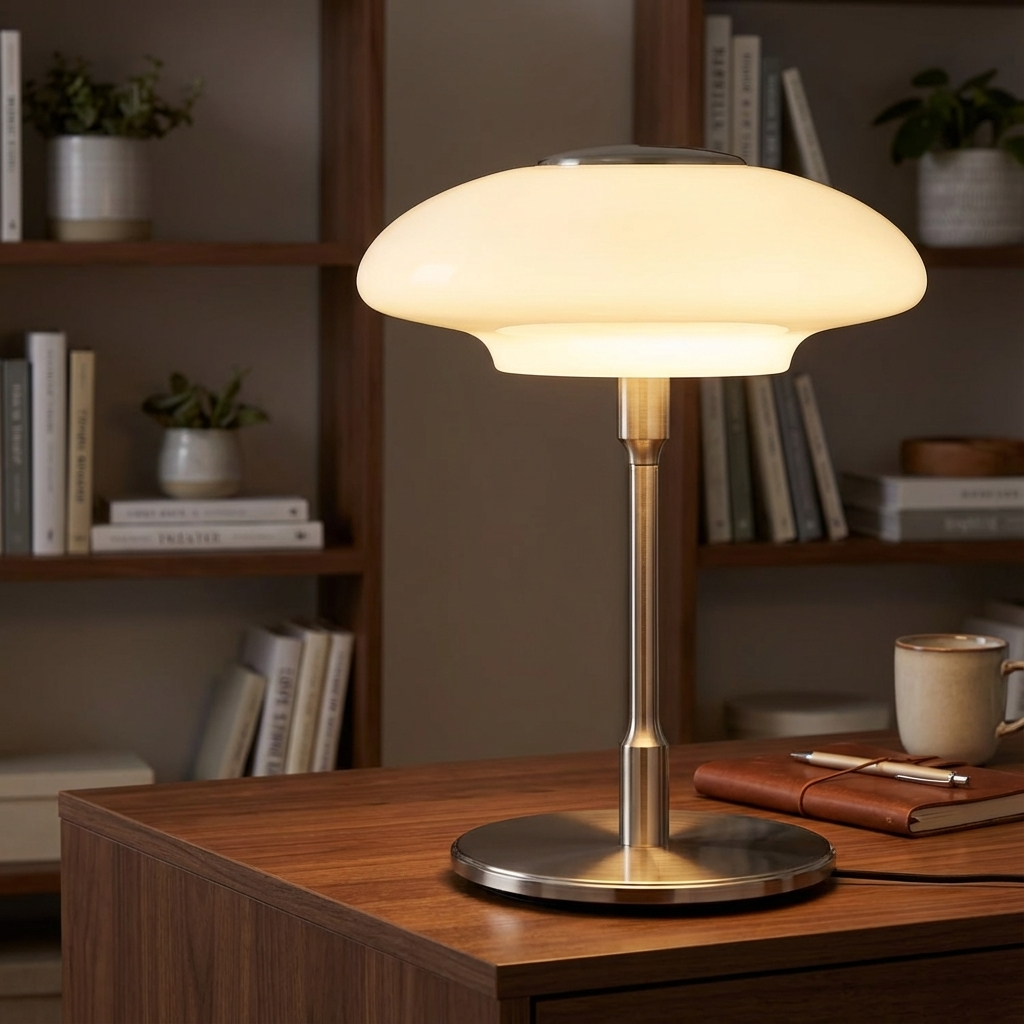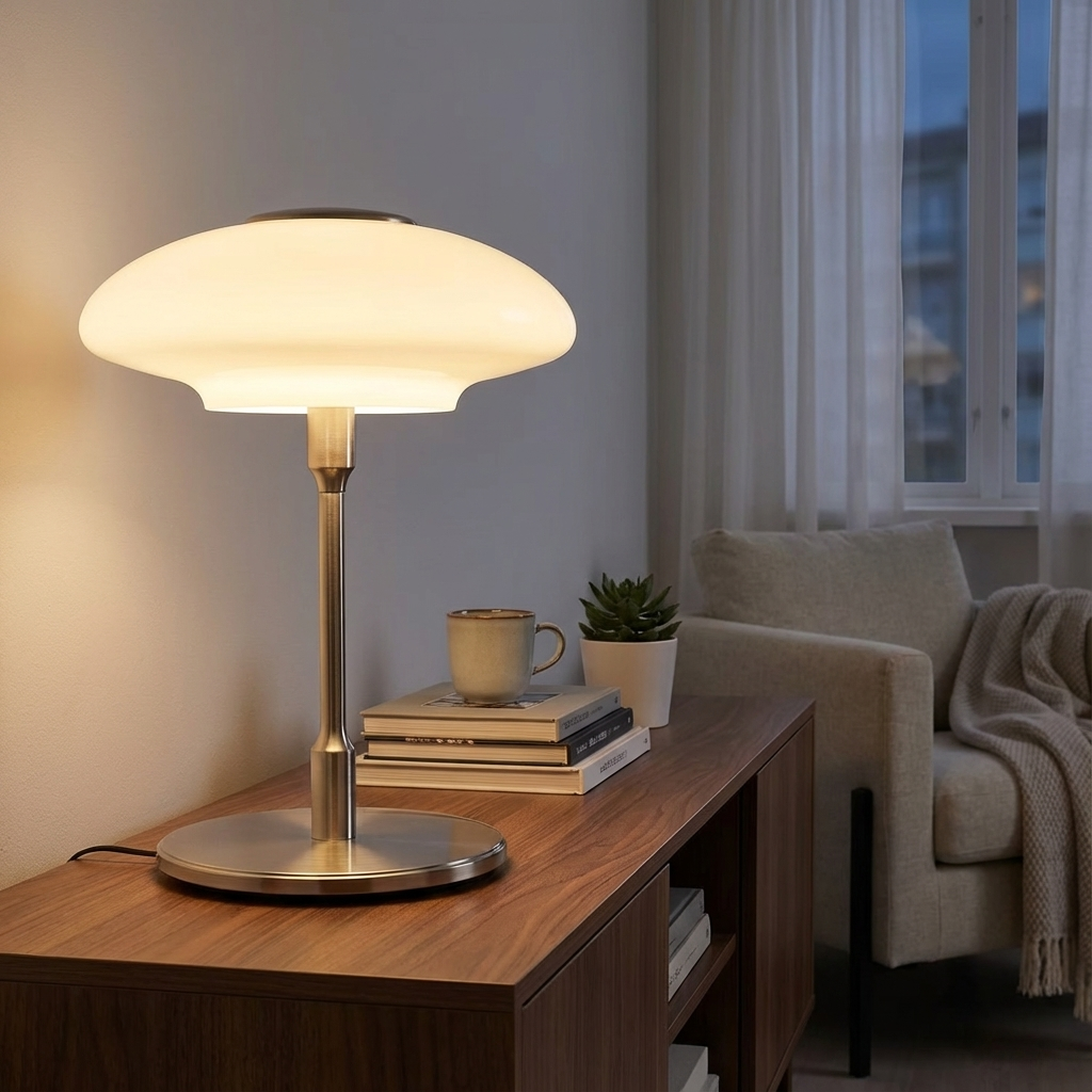 탈뷘 스탠드는 니켈 도금 스틸 베이스와 오팔 화이트 유리갓이 조합된 클래식 스타일의 탁상 스탠드입니다. 부드럽게 확산되는 빛이 공간 전체를 감싸며, 거실·침실·복도 어디에 두어도 포근한 무드를 만들어 줍니다.