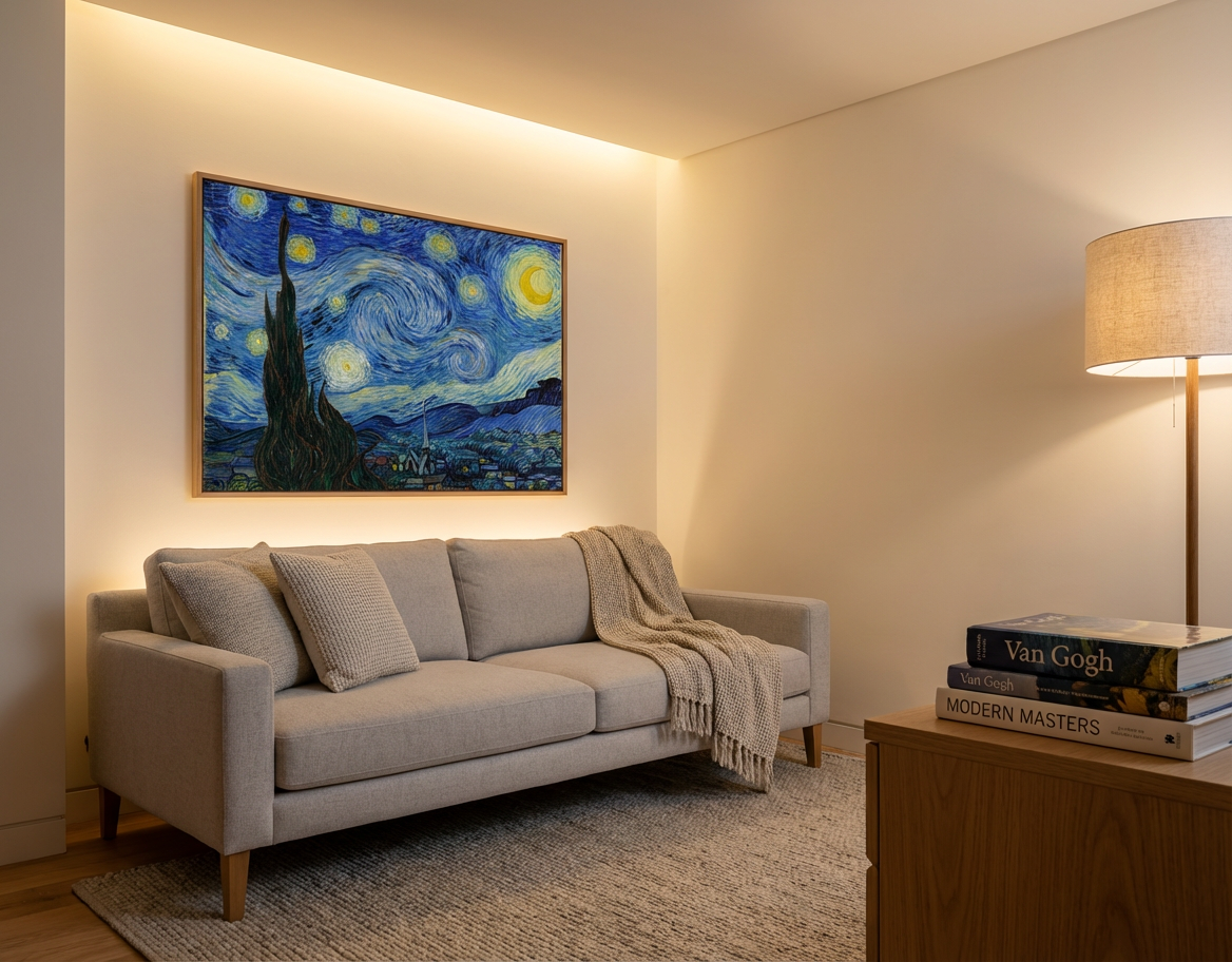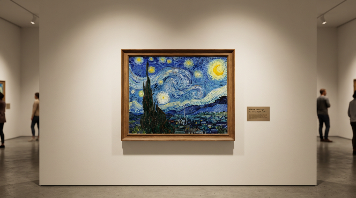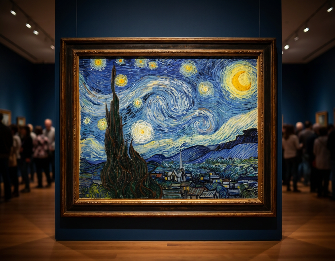 작품을 감상할 때는 별 주변의 원형 광휘, 하늘의 흐름이 만드는 곡선의 방향, 그리고 사이프러스의 실루엣이 화면을 어떻게 묶어 주는지 순서대로 따라가면 좋습니다.